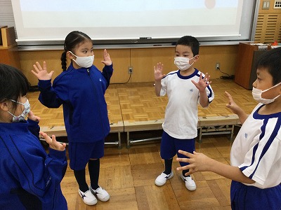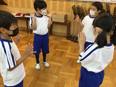 “ひらいたとおもったら…”“つぼんだとおもったら…”と、チームでお花のように集まったり離れたりを、歌に合わせて活動しました。