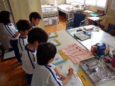 お話の後は、保健室にあるものと先生のお顔をスケッチしました。