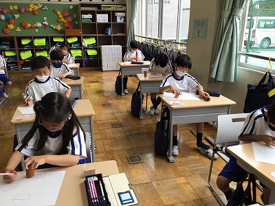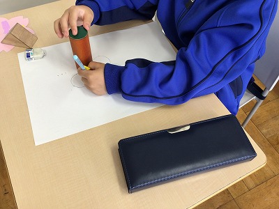 6を2つに分けると、いくつといくつになるかを考えました。教科書の問題に色をぬったり、プリント問題に取り組んだりしました。最後に、いろいろな形を写し取って何かの形をつくってみることもしました。お城やロボット、乗り物などが書けました。