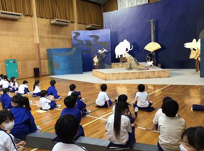 劇団風の子による劇「風の少年シナド」を鑑賞しました。体育館に入ると、いつもの体育館とは違う雰囲気になっていて、わくわくの1年生です。