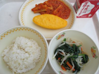 今日の献立は「マカロニミートソース、オムレツ、もやしのナムル」でした。
