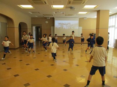 英語歌遊びの後は、朝体操恒例のゲーム「火星人さん」