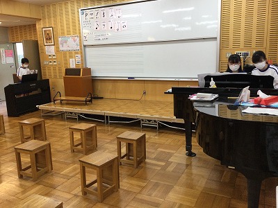 教室では、鍵盤ハーモニカとリコーダーのアンサンブルでしたが、音楽室では、伴奏同士のアンサンブルを演奏することもできました。