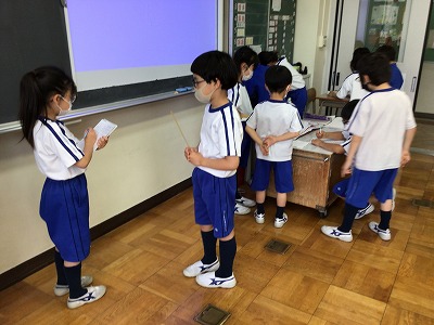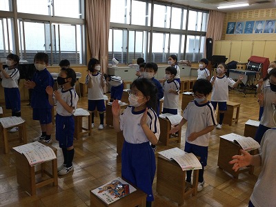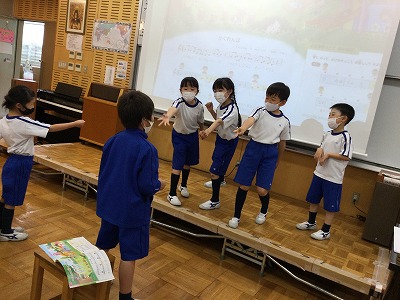 「♪こいぬのビンゴ」の学習が始まりました。英語の時間におなじみの“B・I・N・G・O!”の曲です。