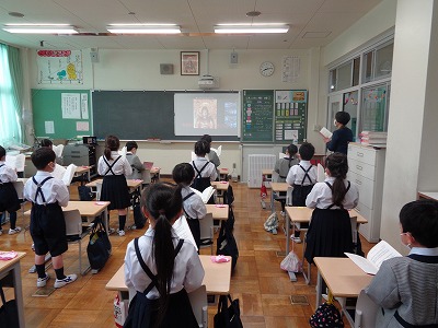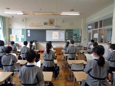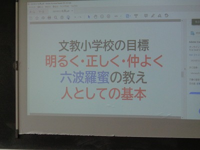 知恩院御影堂(大殿)の写真を見ながら、建物の大きさが本校運動場と同じくらいの広さだと聞いて、各クラスから驚きの声が聞こえてきました。また私達が毎日手を合わせている大きな阿弥陀さまが、御影堂の隣の阿弥陀堂にいらっしゃることも知りました。参拝の折に、5の「今年1年の具体的な自分の目標・テーマ」を誓うことになっていました。『明るく・正しく・仲良く』『六波羅蜜』『人としての基本』から自分のテーマに向かって走り出していると思います。コツコツと積み重ねてほしいです。