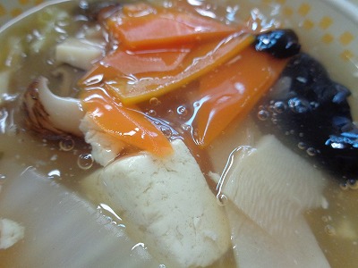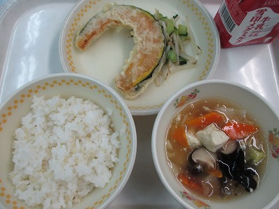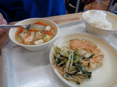 五目豆腐は、豆腐、人参、白菜、しいたけ、筍、きくらげのたくさんの具材が入った料理です。豆腐は全体の味付けが水っぽくならないように、また煮崩れしにくいように、一度蒸してから煮込んでいます。今日は木綿豆腐を使っているので、特にたんぱく質やカルシウムの栄養素がしっかりつまっています。