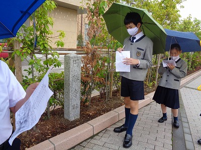 ワグネル博士の石碑の近くに「成勝寺跡の石碑」を見つけました!「やった~!」みんなで駆け寄ります。成勝寺は崇徳天皇の御願寺です。