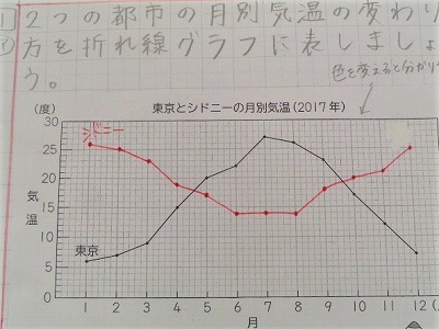 算数は「折れ線グラフ」の学習を続けています。今日は2つのことがらを表す折れ線グラフに挑戦します。東京とシドニーの、2つのグラフを比べて気付いたことを発表し合いました。「冬と夏が反対になっている!」としっかりグラフから情報を読み取ることも出来ました。いよいよグラフの授業もまとめに入ります。