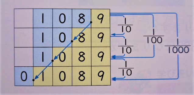 整数や小数を、1/10  1/100  1/1000  にすると、小数点は右にそれぞれ1けた、2けた、3けた移ります。