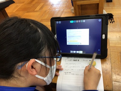 タブレットにブラームスの人柄や功績がわかる資料を送っているので、その資料をもとにして“ブラームスを知る”学習を行いました。