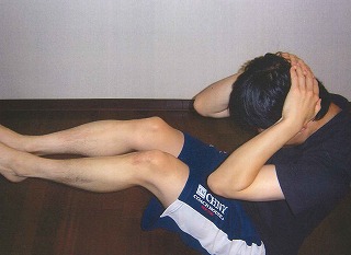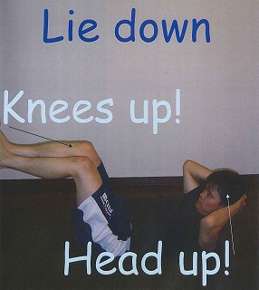 1. Lie down.(横になって) Knees up! (ひざをあげて)