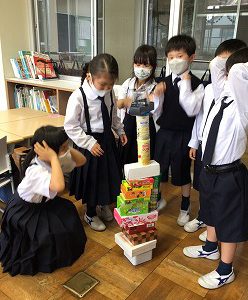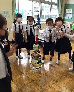 まずは、ペアではこを積み重ね、どんな積み方がいいかを考えました。