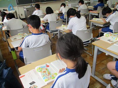 教科書には、町の様子が描かれています。その町の住人になりきって、町の様子や周りの様子を紹介する文章を書きました。