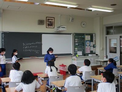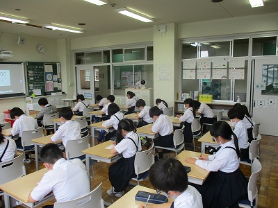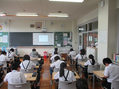 後半は、計算大会です。3年生で学習した「あまりのあるわり算」に取り組んでいます。