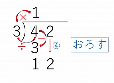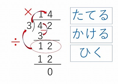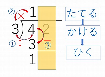 やり方は、十の位のやり方と同じです。「たてる」→「かける」→「ひく」→「おろす」