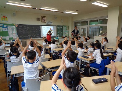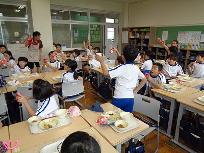 また、その後の給食時にも、4年教室にポール先生がきてくださり、またまた、牛乳乾杯でお祝いしました。