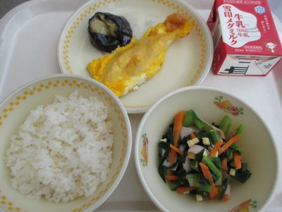 今日の献立は「ささみのピカタ、なすの揚げ煮、小松菜とチーズのおかか和え」でした。