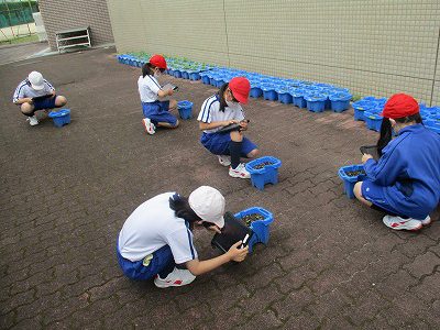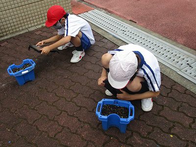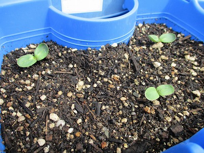 体育の前に、先週種まきをした「ミニひまわり」を見に行きました。