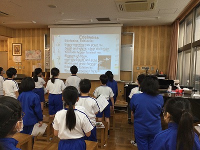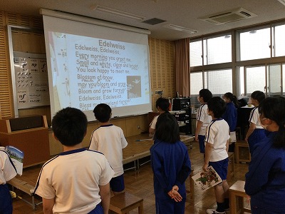 3拍子の♪エーデルワイスと4年生の歌声がマッチして、やさしく音楽室に響いています。今日は、英語のフレーズを紹介しました。いつもの歌詞と言葉のリズムが変わるところに注意して歌っています。