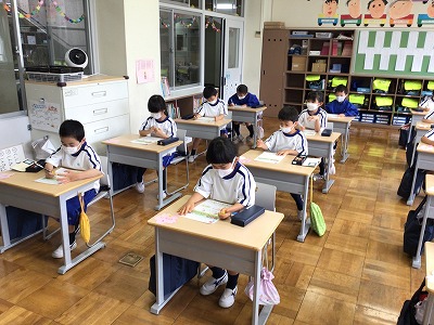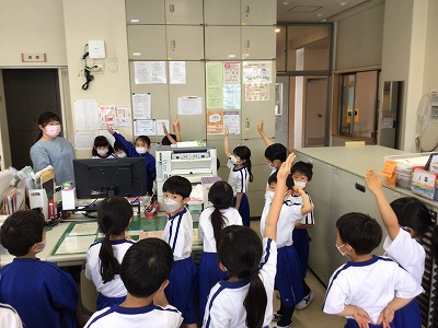 パソコンを使って、いろいろなお仕事をされていることが分かりました。いつも笑顔の先生です。他にも1年生に関わるお仕事がたくさんあります。