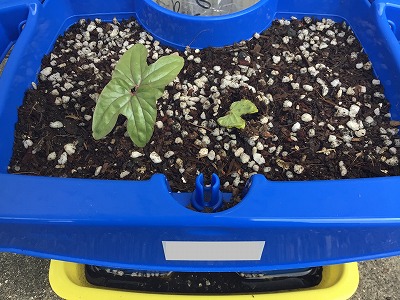 アサガオの芽が出てきています。中には双葉(子葉)がはっきり見られる鉢もあります。