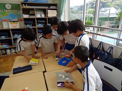 4時間目を終え、給食準備タイムになると、仲間達も給食の時間です。給食当番以外の子ども達が集まって、餌をやったり、水替えをしたり。(ちなみに、サワガニの餌はお素麺です。季節を先取りしているようです。)