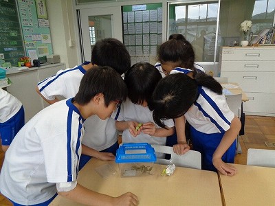 「青虫くん」と「さわがにさん」です。(性別不明です)クラス児童がケース付き・餌持参で連れてきた仲間です。名前は、まだついてはいません。