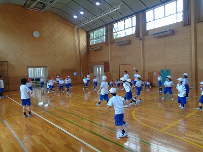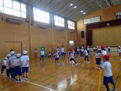 子ども達は、4つのグループ(赤A・赤B・白A・白B)に分かれて、2年生と一緒にドッジボールを楽しみました。
