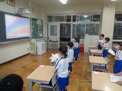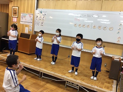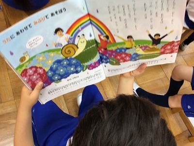 朝根っこタイムは、朝歌です。じめじめした梅雨の雰囲気を吹き飛ばすかのように、「にじ」や「アルプス一万尺」、「手のひらを太陽に」「パプリカ」を歌いました。