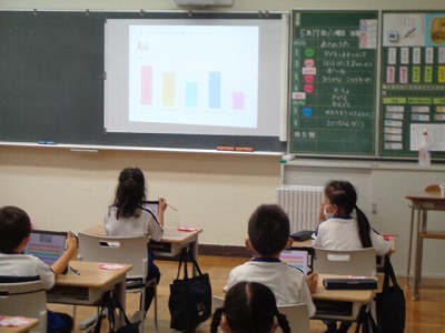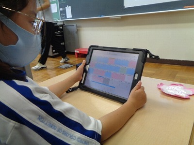 タブレットでアンケートに答える練習をしました。基本の行いについて、自分がふだんできているかどうかという内容です。回答を提出する時に、答えの内容に合わせてカードの色も変えてみました。