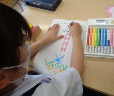〇で雪だるま、□で電車、Δで富士山、形を組み合わせてロケットなど工夫して仕上げていました。