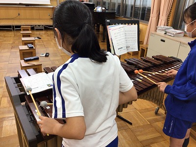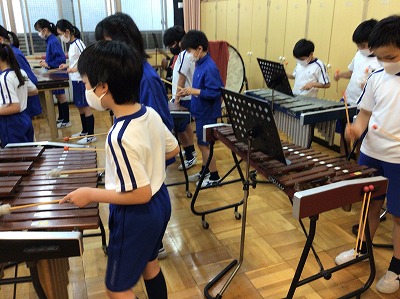 階名唱でもたっぷり練習を行い、残りの時間で鍵盤楽器での、メロディ練習を始めました。木琴では、“トレモロ”を取り入れてもらうよう、指示しました。