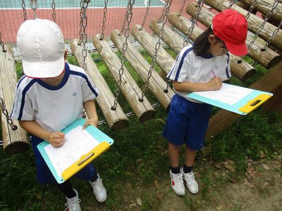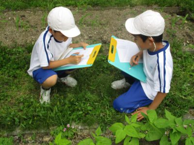 2年キッズは、運動場やビオトープの植物を一生懸命探していました。