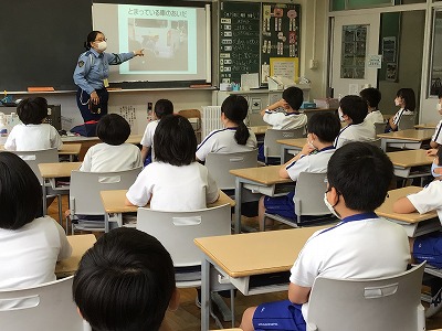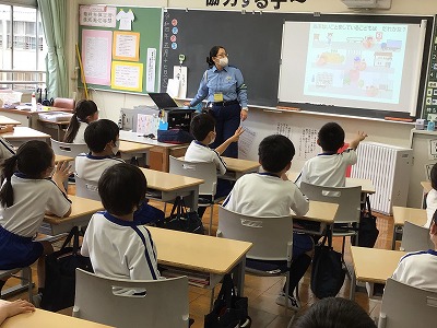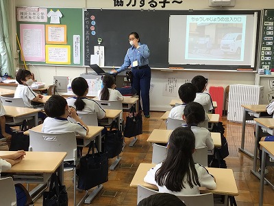 川端警察署の安全課の方から、横断歩道を渡るときの約束や信号の説明、安全確認など具体的な例を出して、交通ルールを教えていただきました。