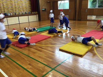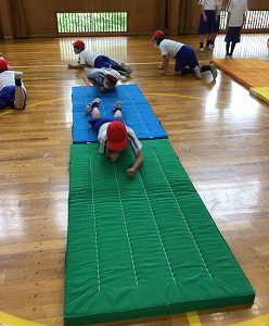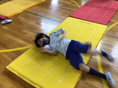 かえるの脚打ちやゆりかご、丸太、前転など、みんな笑顔で楽しく頑張っていました。