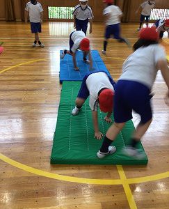 まずは、各グループに分かれて、マット遊びに挑戦しました。