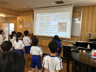 英語の時間に、ミスターヨコヤマやポール先生に聞いてもらおうと練習をしています。歌詞のあいまいなところは、プリントにして渡しているので「ちらちらっと見ながら歌えば良いね!」と話しています。