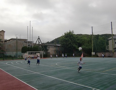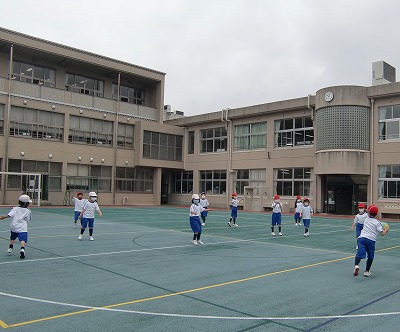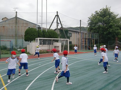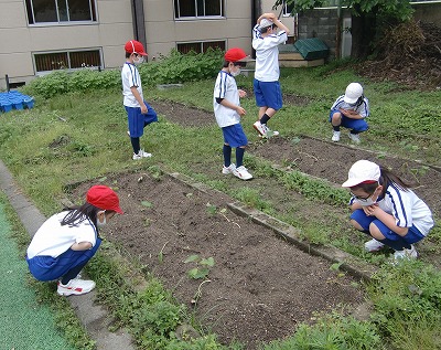 小学校のグラウンドを走った後、先週に植えた「さつまいも」の様子を見に行きました。