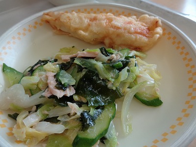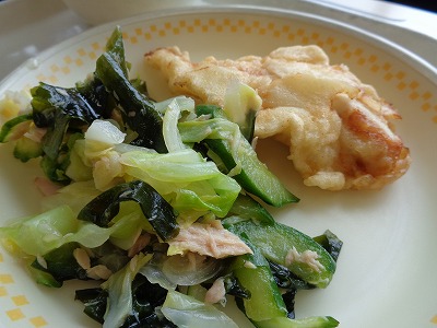 ミネラルがたっぷりのわかめときゅうり、キャベツを合わせたサラダです。