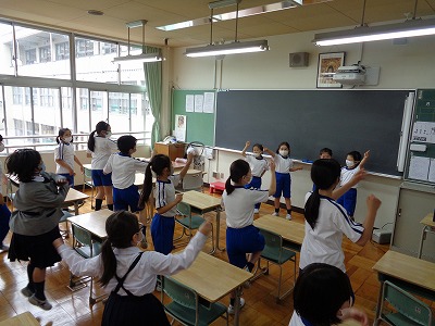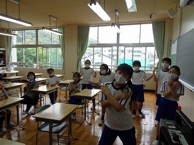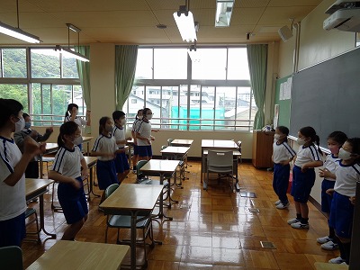 なんとお手本の先生は、お姉さん・お兄さん達です。突然のお願いでしたが、快く引き受け、ダンサー顔負けの見事なパフォーマンスでしっかり歌ってくれたのでした! 前に出た1年生も、それにつられて体が動きます。