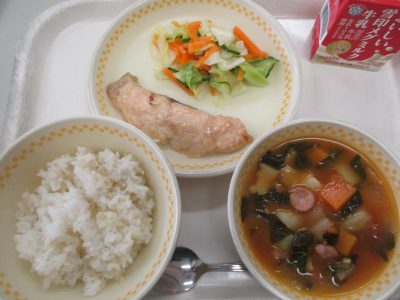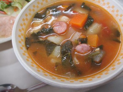 ☆ ミネストローネは「具だくさんのスープ」という意味を持つ野菜をたっぷり使ったイタリアのスープです。ミネストローネといえばトマトベースの赤いスープというイメージですが、特にきまりはないようです。今日のミネストローネは玉ねぎ、人参、じゃがいも、ひよこ豆など、具だくさんに仕上げました。