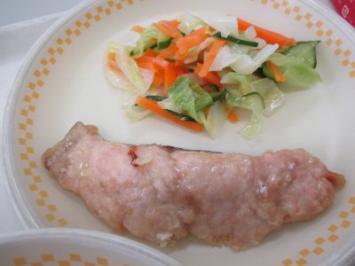 ☆ 鮭をこんがり焼いたムニエルは、バターの香りがおいしい料理です。下味の塩こしょうは、つきすぎないように注意して調理しています。