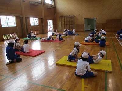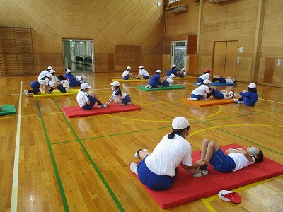 30秒間集中して取り組み、上体起こしの回数が伸びるよう、頑張る5年生の様子が見られました。