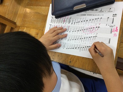 この時間と並行してリコーダーの演奏曲も鑑賞しました。「森ひばり」や「うそどり」「大きな古時計」など、“小鳥”をイメージするような音楽からおなじみの曲まで、リコーダー二重奏、重奏などの鑑賞を通して、“やさしい音色の楽器”を3年キッズにインプットしておきたいと考えました。
