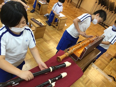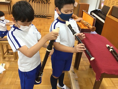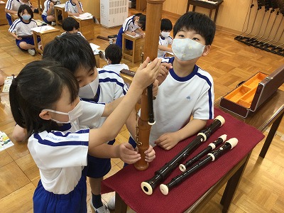 「重っ!」「長っ!」と、自分たちの「ソプラノリコーダー」と違うリコーダーの存在に気づき、“つくり”や“重さ・長さ”を体感していました。