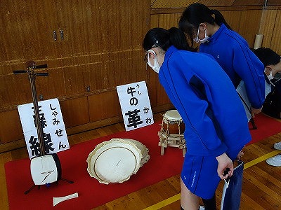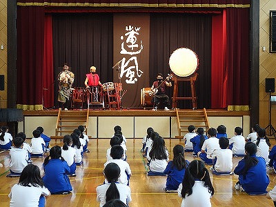 今日の3・4校時は楽しみにしている児童も多かった和楽器の演奏鑑賞会です。今回は「蓮風(RENPU)」の3名による演奏を鑑賞させていただきました。