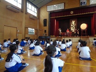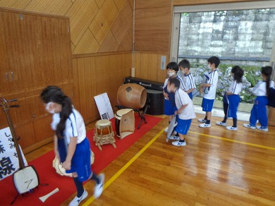 他にも、三味線、篠笛などの和楽器演奏と、楽器名のレクチャーを聞き、最後は代表の人がステージに上がって、実際に太鼓をたたくこともできました。