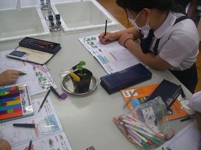 「子葉」の葉の様子を確認して、観察しています。