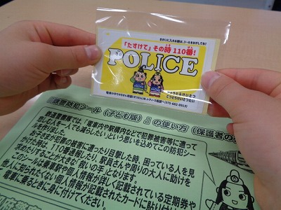 これは「てっけいぼうはんシール」といいます。ICカードやケース等に貼ったりするものです。(改札機に通す定期券には貼れませんが、イコカ・ピタパなどのタッチ式は可能です。)駅の中で怖い思いをしたら、それを近くの大人などに見せて、助けをお願いすることができます。