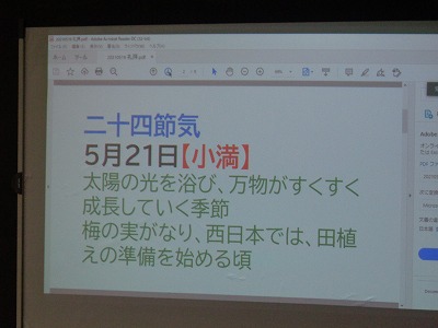 始めに二十四節気の「小満」についてお話がありました。5月21日に当たります。西日本では、ちょうど田植えの準備を始める時期にあたるそうです。
